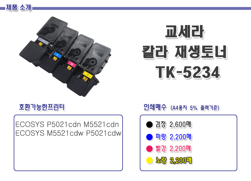 교세라 T/C 호환 TK-5234 4색1택 ECOSYS P5021cdn M5521cdn M5521cdw P5021cdw