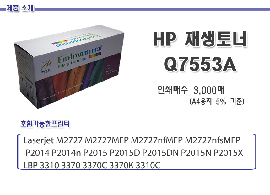 > HP T/C 호환 Q7553A 검정 3K Laserjet M2727 M2727MFP M2727nfMFP M2727nfsMFP P2014 P2014n P2015 P2015D P2015DN P2015N P2015X LBP 3310 3370 3370C 3370K 3310C
