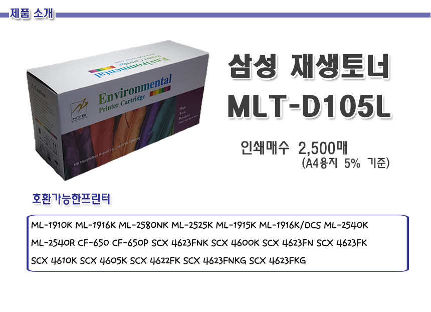 삼성 T/C 호환 MLT-D105L 검정 2.5K ML 1910K 1916K 2580NK 2525K 1915K 1916K/DCS 2540K 2540R CF 650 650P SCX 4623FNK 4600K 4623FN 4623FK 4610K 4605K 4622FK 4623FNKG 4623FKG