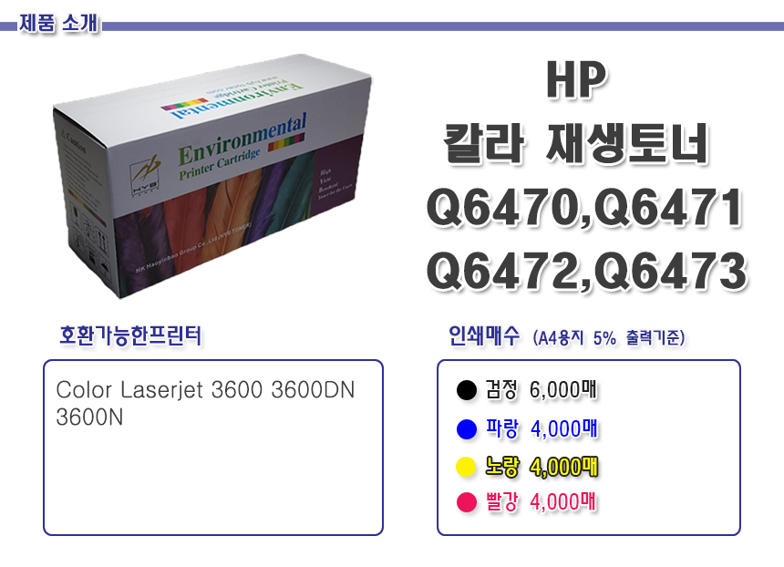 > HP T/C 호환 Q6470 Q6471 Q6472 Q6473 4색1택 Color Laserjet 3600 3600DN 3600N