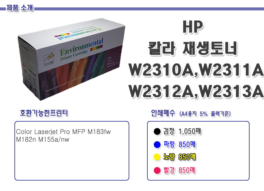 > HP T/C호환 W2310A W2311A W2312A W2313A 4색1택 Color Laserjet Pro MFP M183fw M182n M155a/nw