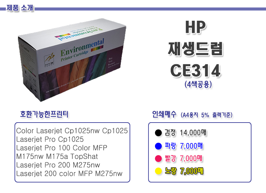 > HP D/U 호환 CE314 4색공용 Color Laserjet Cp1025nw Cp1025 Laserjet Pro Cp1025 Laserjet Pro 100 Color MFP M175nw M175a TopShat Laserjet Pro 200 M275nw Laserjet 200 color MFP M275nw