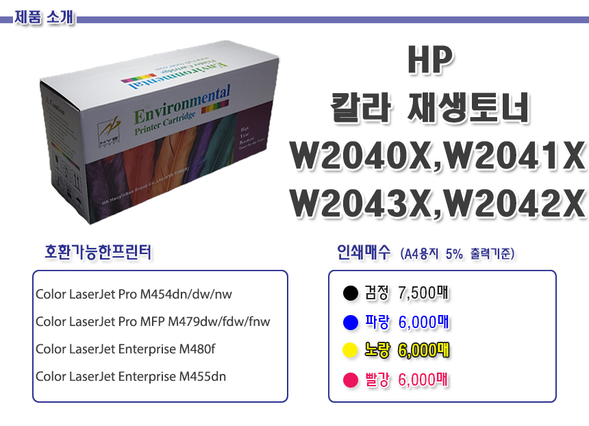 > HP T/C 호환 W2040X W2041X W2043X W2042X 4색1택 Color LaserJet Pro M454dn/dw/nw MFP M479dw/fdw/fnw Enterprise M480f M455dn